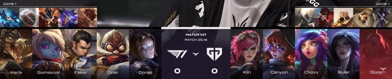 T1选用:Doran鳄鱼、Oner赵信、Faker发条、Gumayusi飞机、Keria波比