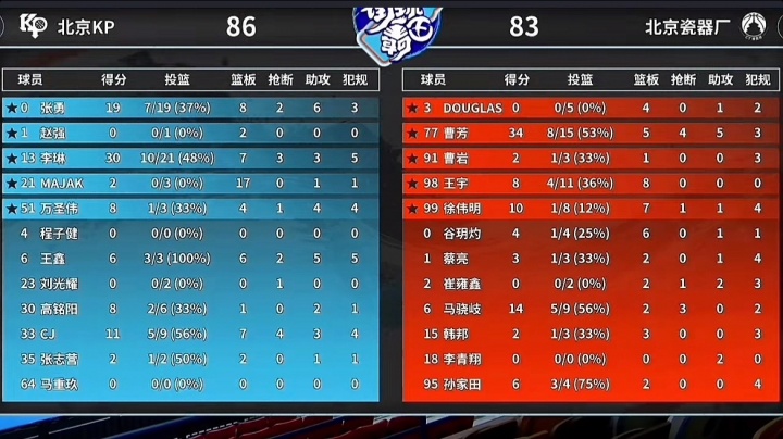8月22日电 “街球霸王”全国争霸赛半决赛爆出冷门,巡回赛榜首北京瓷器厂以83-86憾负排名第五的北京KP队,无缘决赛。末节比赛中,瓷器厂最多落后11分,虽在曹芳率领下将分差缩小至3分,但因马骁岐关键罚球未中错失追平良机。最后时刻曹芳遭三人围堵分球韩邦,三分出手未中憾失胜局。此役曹芳手感火热,15投8中砍下全场最高34分,并贡献5篮板5助攻4抢断。...